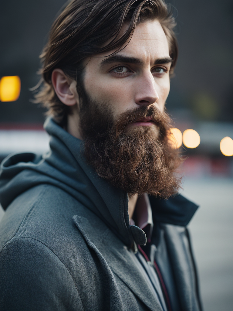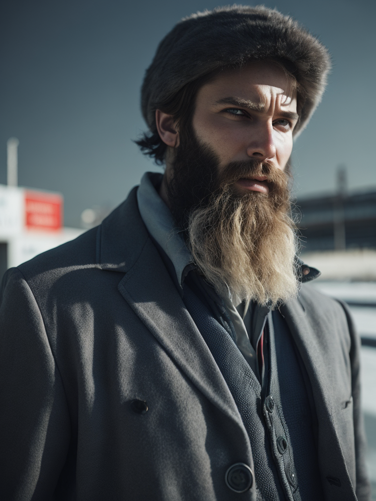 portrait of an ice hockey player with a big beard, in front of the hockey stadium, elegant, vogue, fashion magazine, sharp focus, Dramatic Lighting, Depth of field, Incredibly high detailed, blurred background