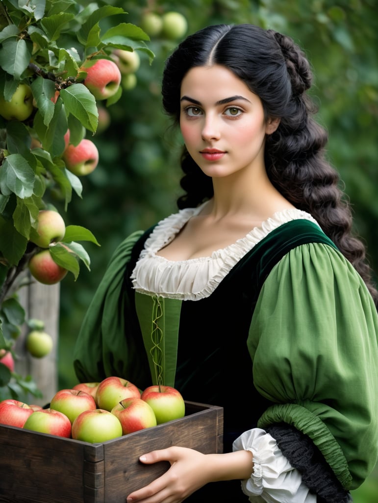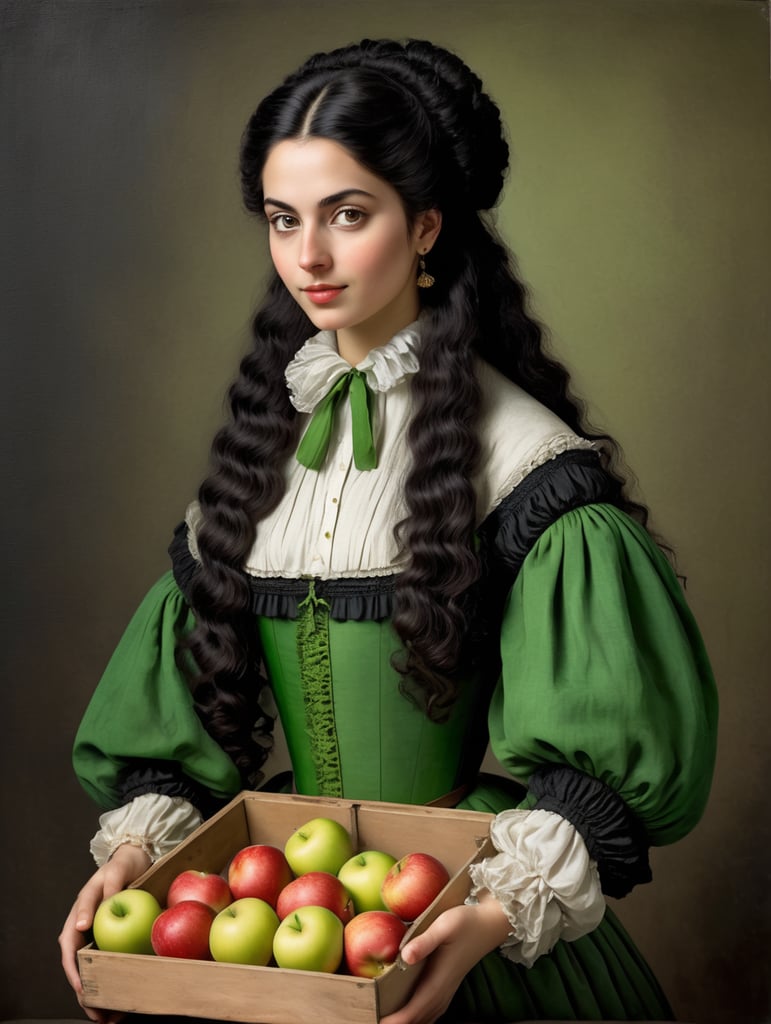 Portrait of an Italian girl in 17th century clothing holding a box of ripe apples. The apples have the right texture and green color. The box is made of dark wood with a beautiful texture. The girl has long black hair