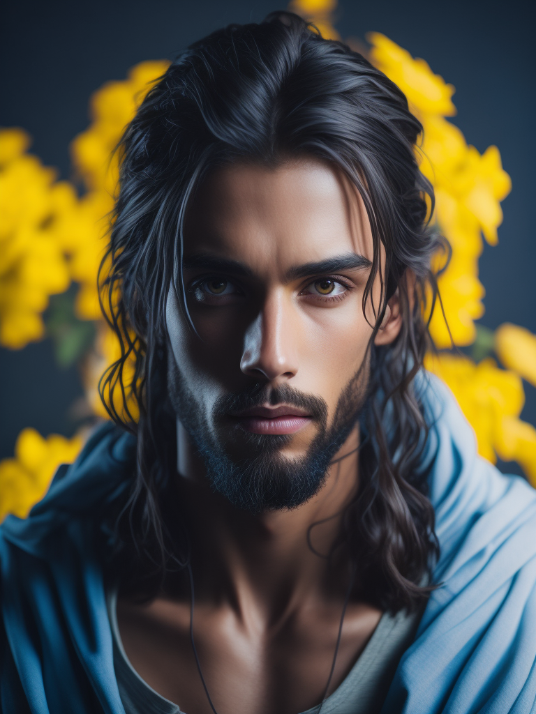 A portrait of jesus blue, white and yellow manl, highly detailed, intricate, sharp focus, digital art