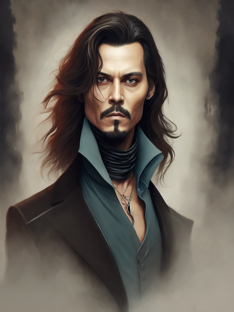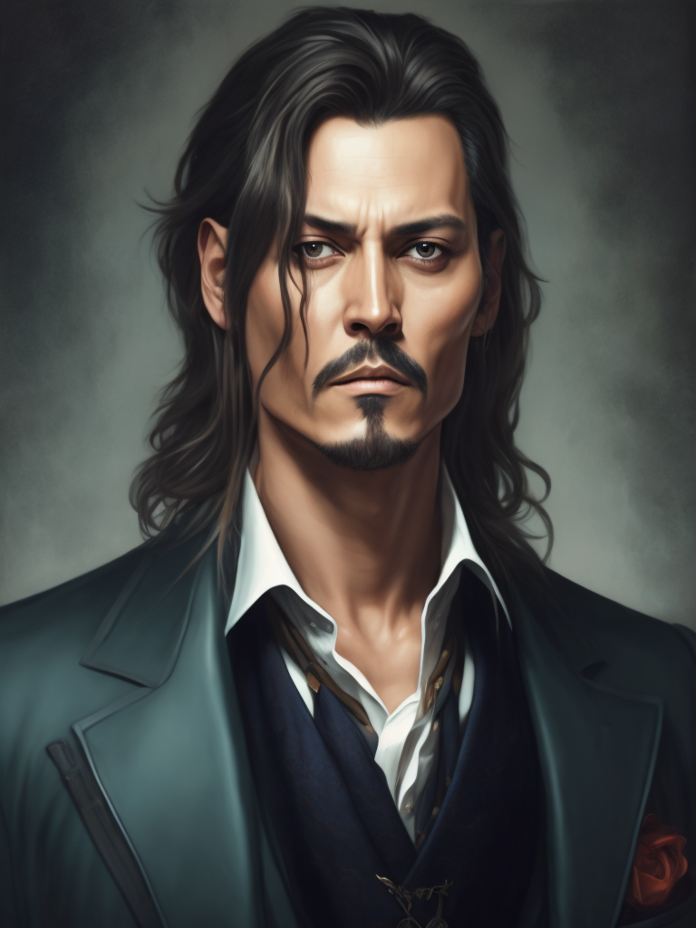 Portrait of Johnny Depp as Count Dracula, majestic look, long hair, he wears 18th-century style clothing, dark background, contrasting light, detailed face, muted toneshttps://lumenor.ai/terms-of-service/https://lumenor.ai/ai-generated-images-gallery/h7WLZOLfnY/lumenor AIlumenor AI