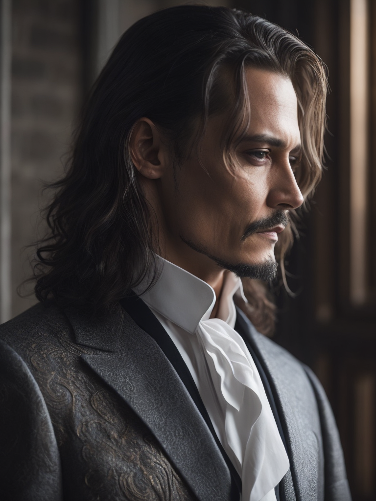 Portrait of Johnny Depp as Count Dracula, majestic look, long hair, mantle, against the backdrop of a medieval castle, detailed background, contrasting light, detailed face, muted toneshttps://lumenor.ai/terms-of-service/https://lumenor.ai/ai-generated-images-gallery/h7WPPJlanT/lumenor AIlumenor AI