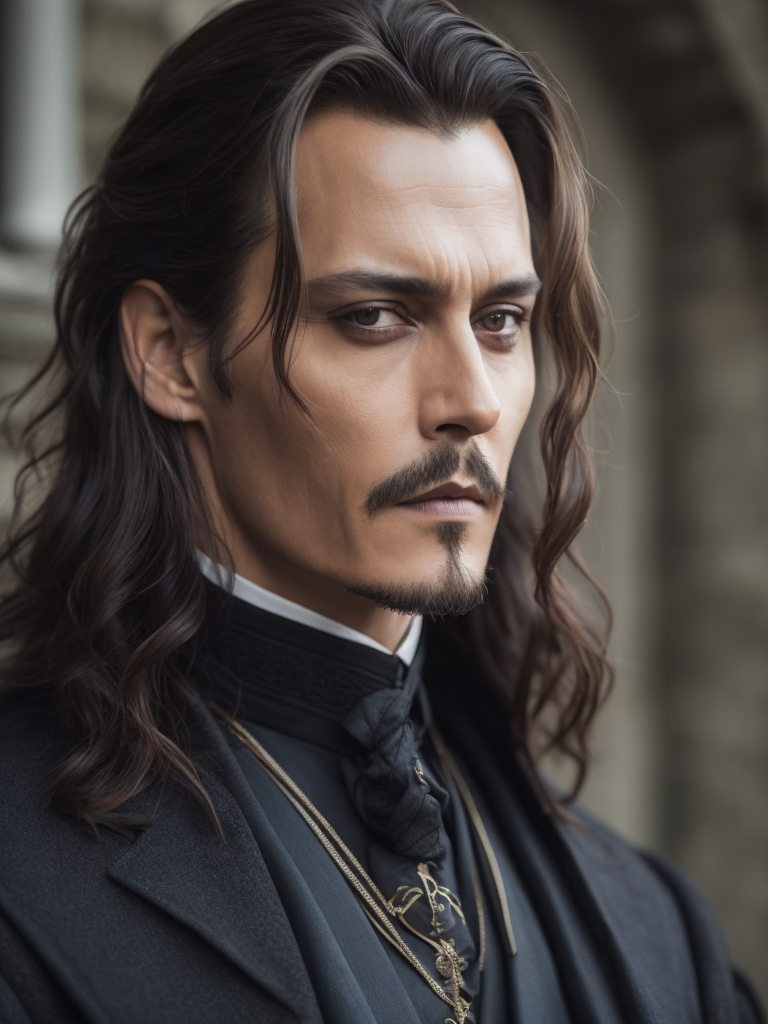 Portrait of Johnny Depp as Count Dracula, majestic look, long hair, mantle, against the backdrop of a medieval castle, detailed background, contrasting light, detailed face, muted tones