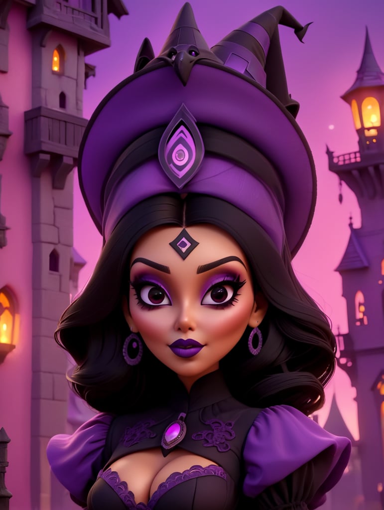Portrait of Kim Kardashian in a witch costume for Halloween, scary dark makeup on her face, gloomy dark atmosphere, vintage 70s style, purple, pink and black colors, high detail photo, professional photo, against the backdrop of an old creepy castle, contrasting light, bright colors, deep dark atmosphere