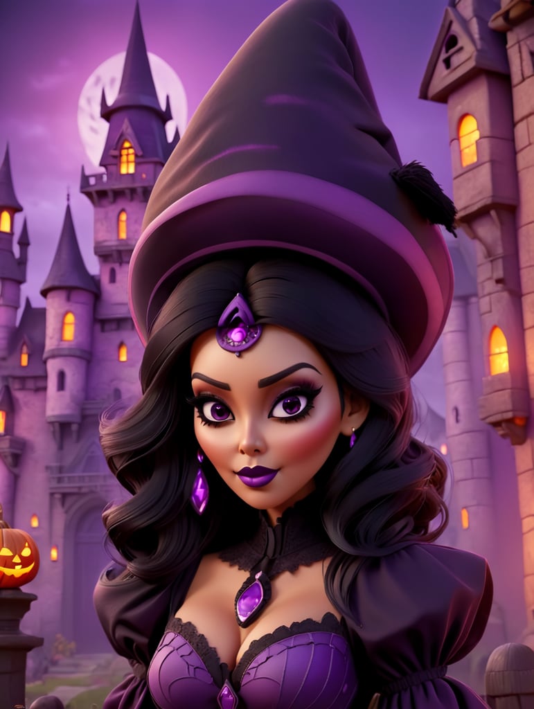 Portrait of Kim Kardashian in a witch costume for Halloween, scary dark makeup on her face, gloomy dark atmosphere, vintage 70s style, purple, pink and black colors, high detail photo, professional photo, against the backdrop of an old creepy castle, contrasting light, bright colors, deep dark atmospherehttps://lumenor.ai/terms-of-service/https://lumenor.ai/ai-generated-images-gallery/hqHbtKQab5/lumenor AIlumenor AI