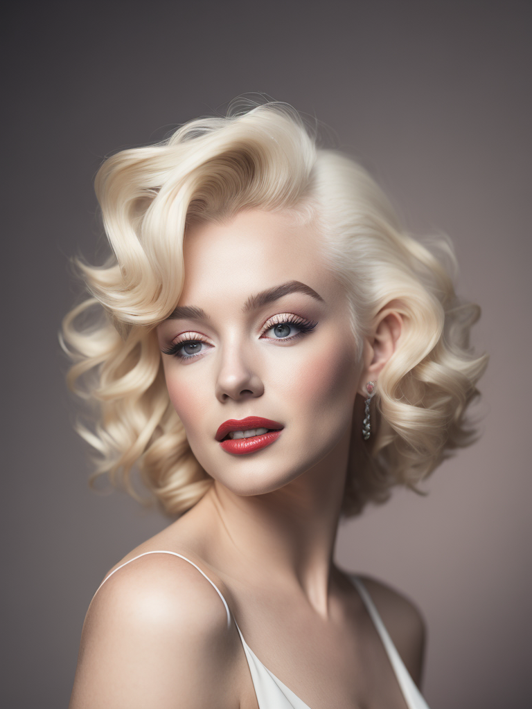 Portrait of Marilyn Monroe, ultra realistic, blonde hair, white dress, bright makeup, gradient background,https://lumenor.ai/terms-of-service/https://lumenor.ai/ai-generated-images-gallery/h7HqzBqhoM/lumenor AIlumenor AI