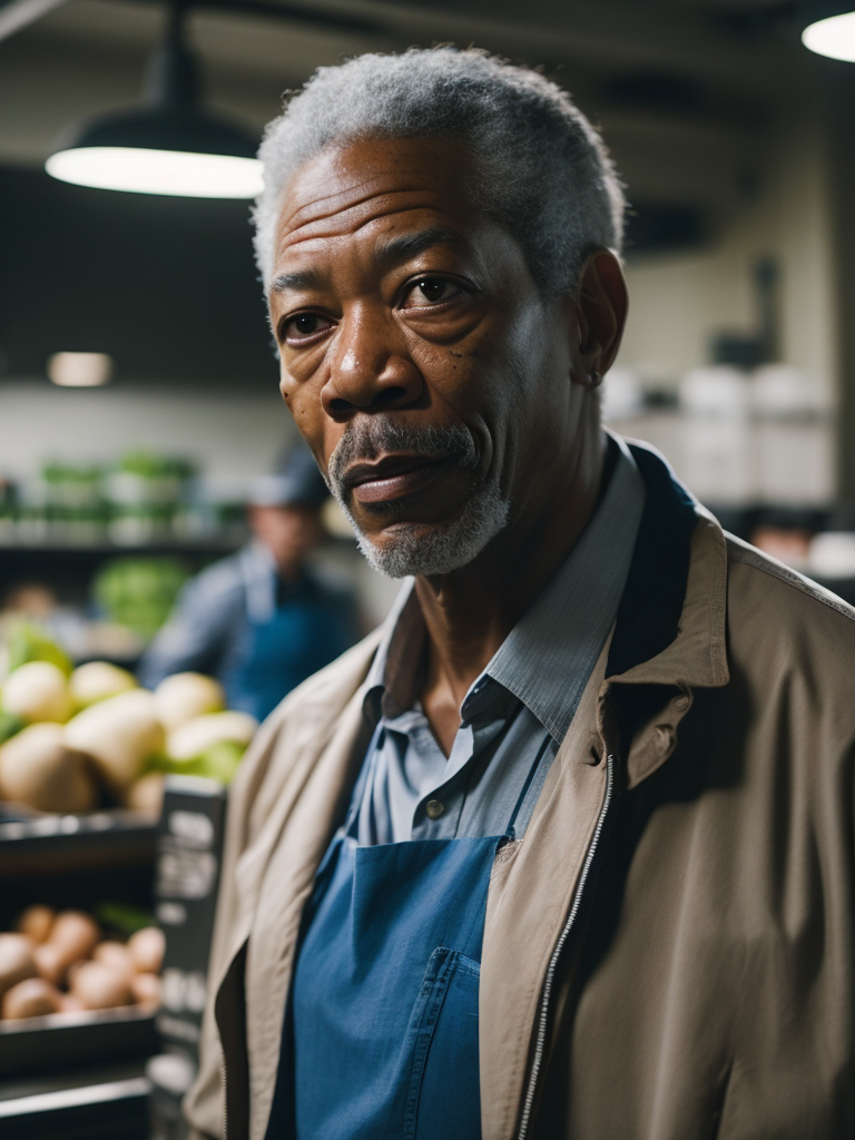 portrait of Morgan Freeman as a cashier, wearing a blue apron, in a grocery store