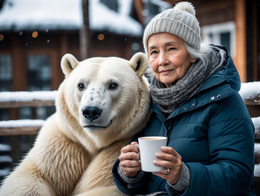 - portrait old woman coffee winter clothes polar bear outdoor location ice and snow cold environment highly detailed friendly interaction