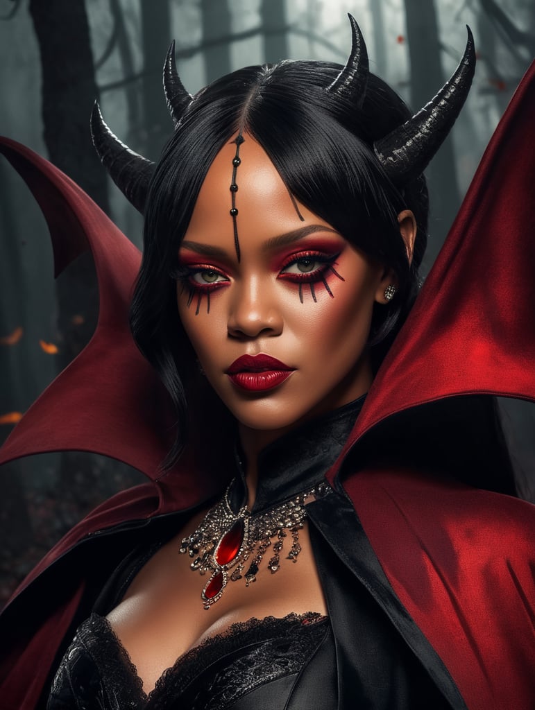 - rihanna portrait dracula halloween costume scary face makeup dark atmosphere vintage style red and black colors high detail photo professional photo shot creepy forest backdrop contrasting light