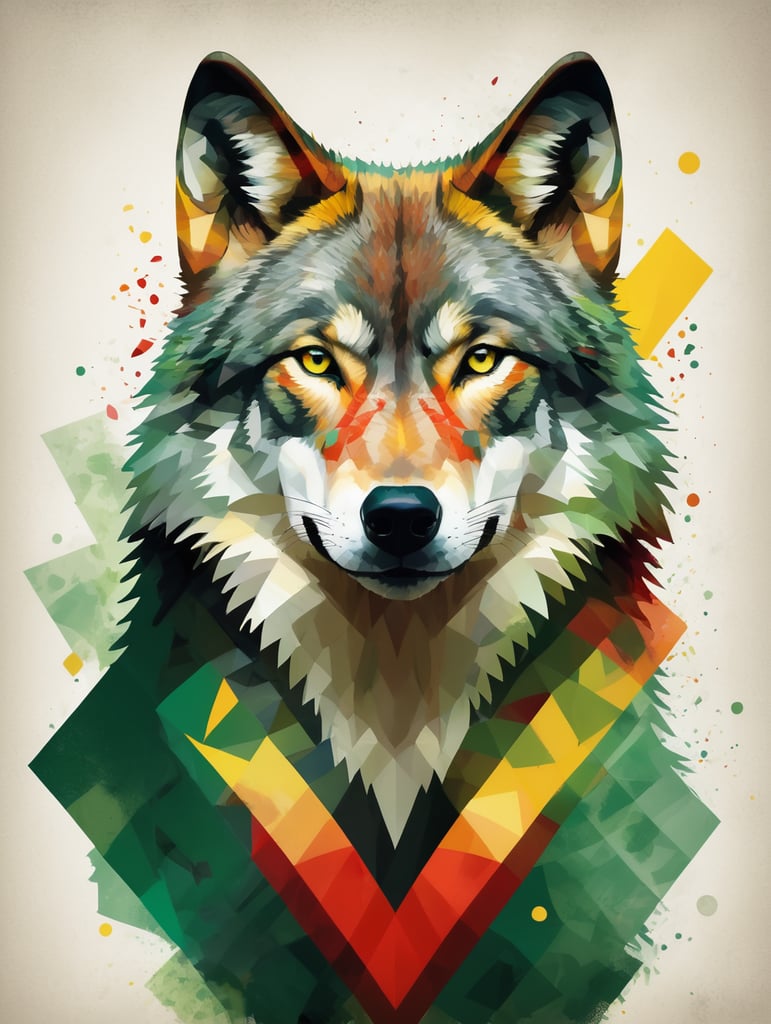- wolf portrait abstract shapes green yellow red vibrant colors depth pop culture contemporary illustration