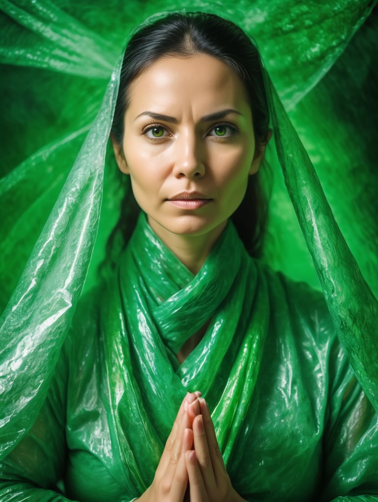 Portrait of a woman experiencing spiritual experience, wrapped green film
