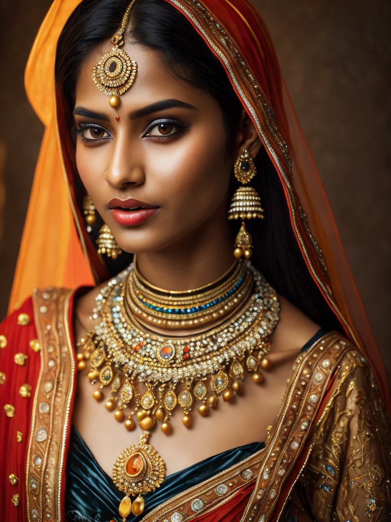 Portrait of a young, beautiful girl from India in a folk Indian dress and jewelry, Bright expressive makeup, Dramatic Lighting, Depth of field, Incredibly high detailed, bollywood