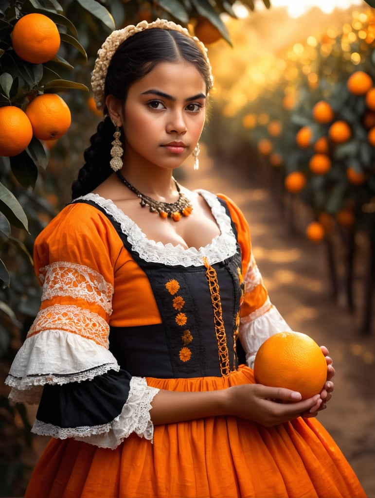 Portrait of a young, dark and beautiful Mexican girl growing oranges from Mexico in 18th century Mexican folk dress, dramatic lighting, depth of field, orange trees in the background. Oranges should have a beautiful, even structure. Incredibly high detail holding fresh oranges in hand