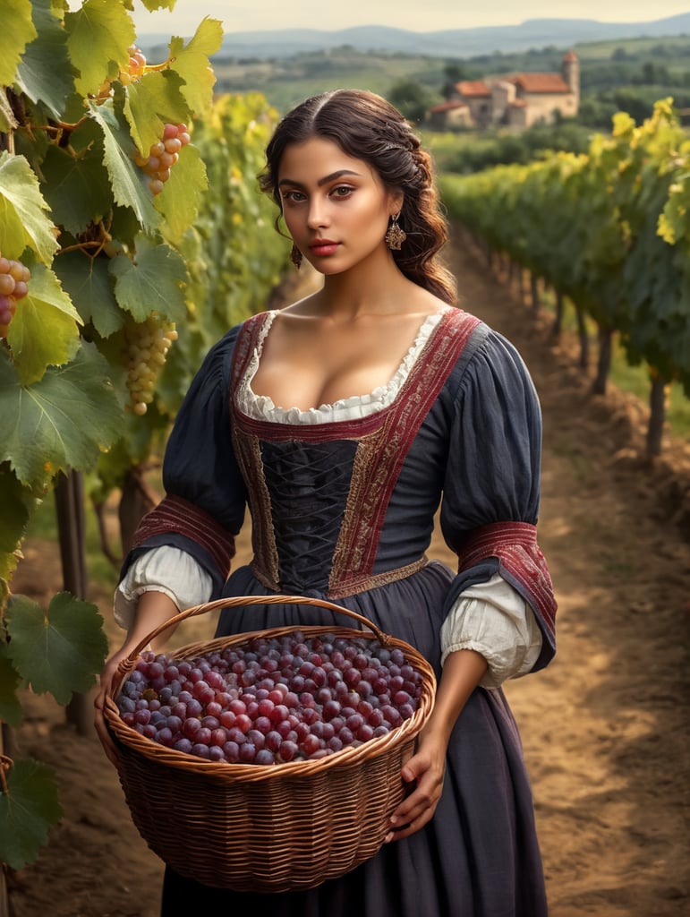 - portrait young girl italian red grapes sicily 17th century italian folk peasant clothing dramatic lighting vineyards high detail