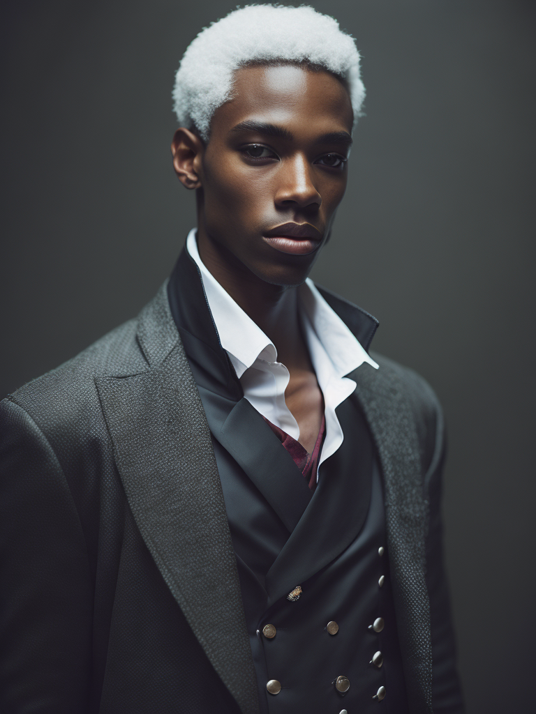 portrait of young man with black skin, short white hair, dressed in a tailcoat, intricate, elegant, highly detailed, digital painting, concept art, sharp focus, ultra realistic, Dramatic Lighting, Depth of field, Incredibly high detailed