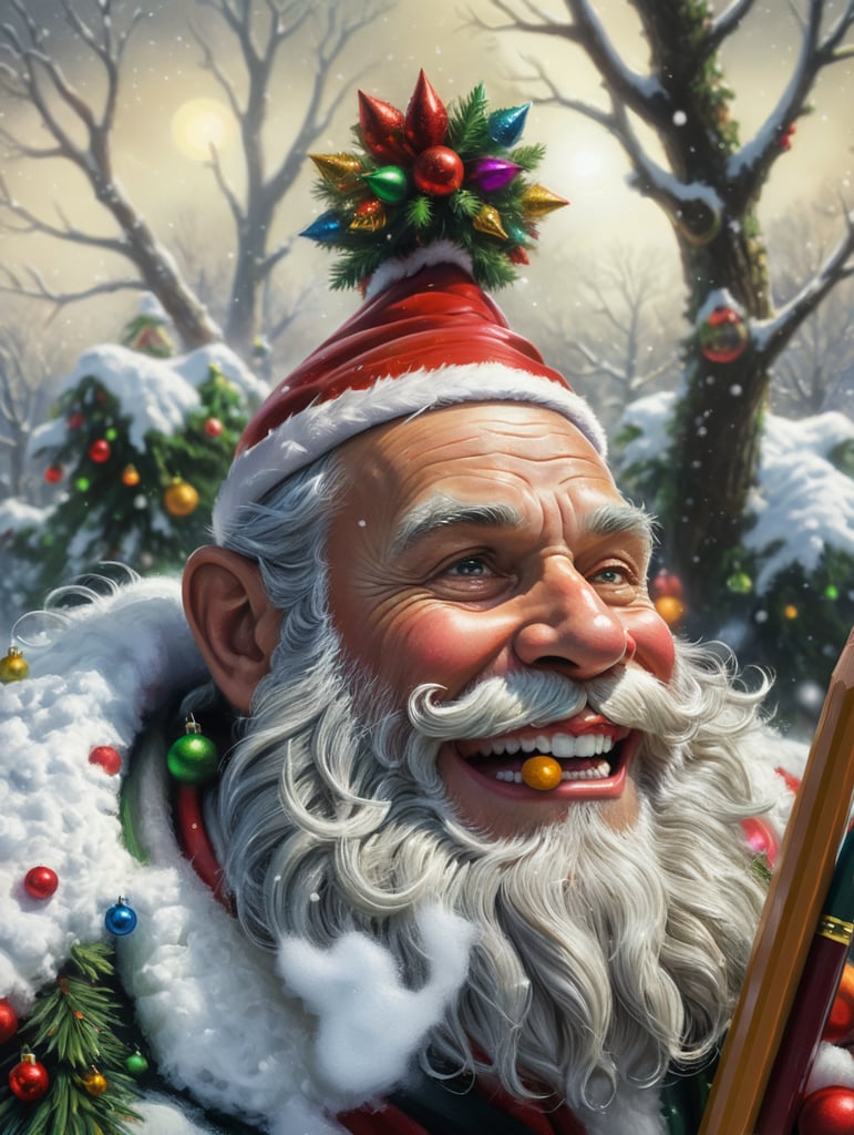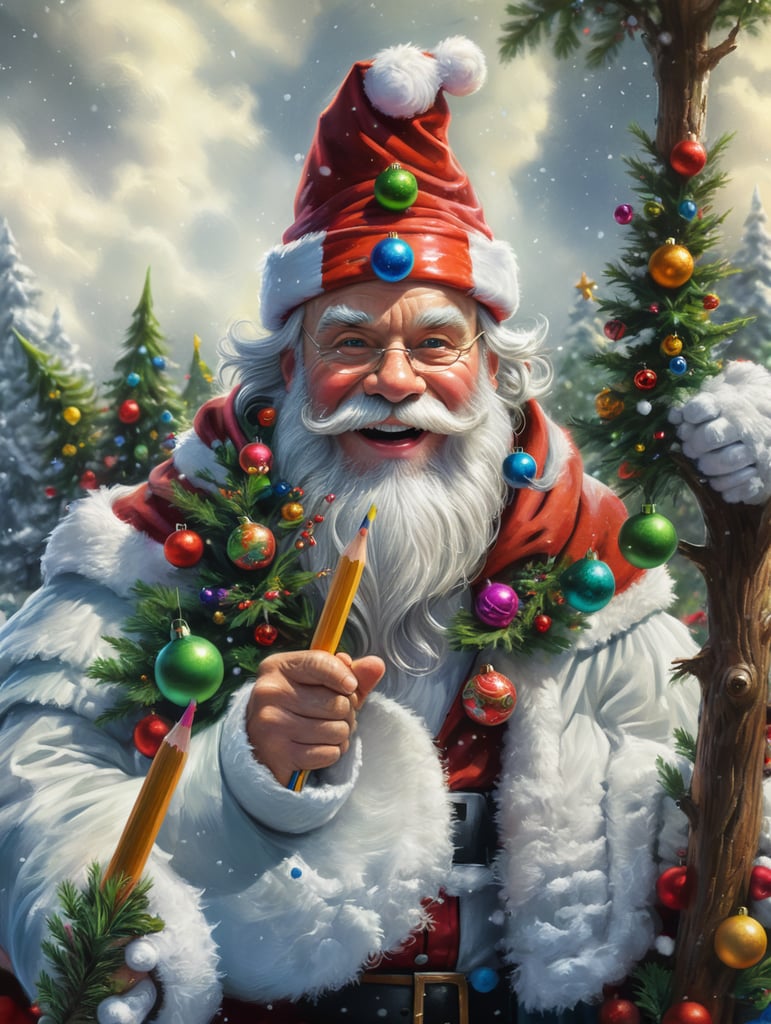 Cartoon closeup of friendly and funny Santa Claus with christmas tree snow elves and christmas decoration colored pencils and paintbrushes