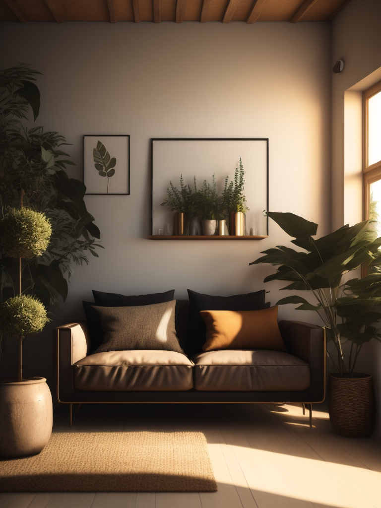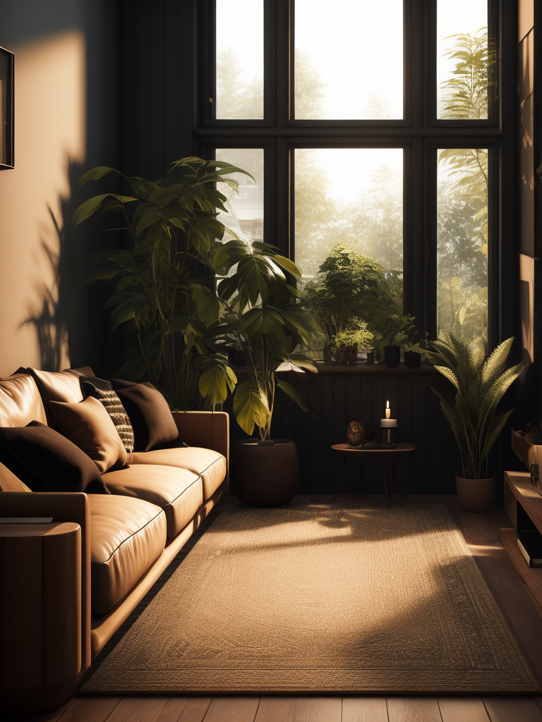 A primitive interior design style for modern times, Living room, Minimalist House Sweden, light colors, sunshine, green plants, with earthy finishes and cozy detailing throughout, candle lit evening time
