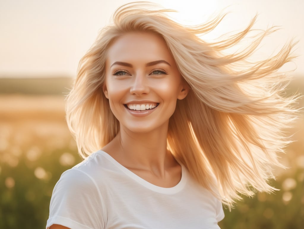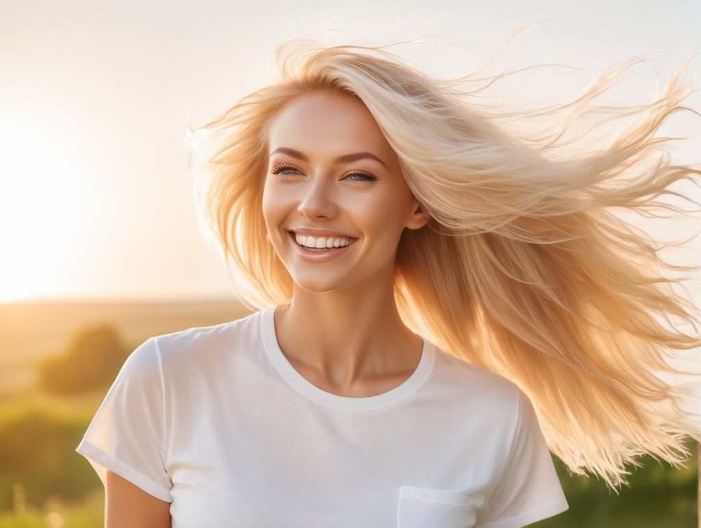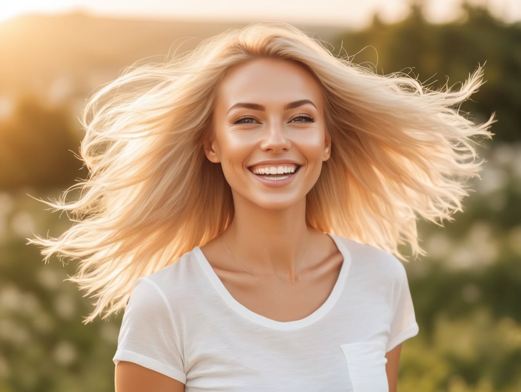 Attractive happy young woman in white t-shirt with flying hair enjoying free time at sunset outdoors. Portrait of a blonde beauty in summer. Freedom spring lifestyle concept. Sun glow on background