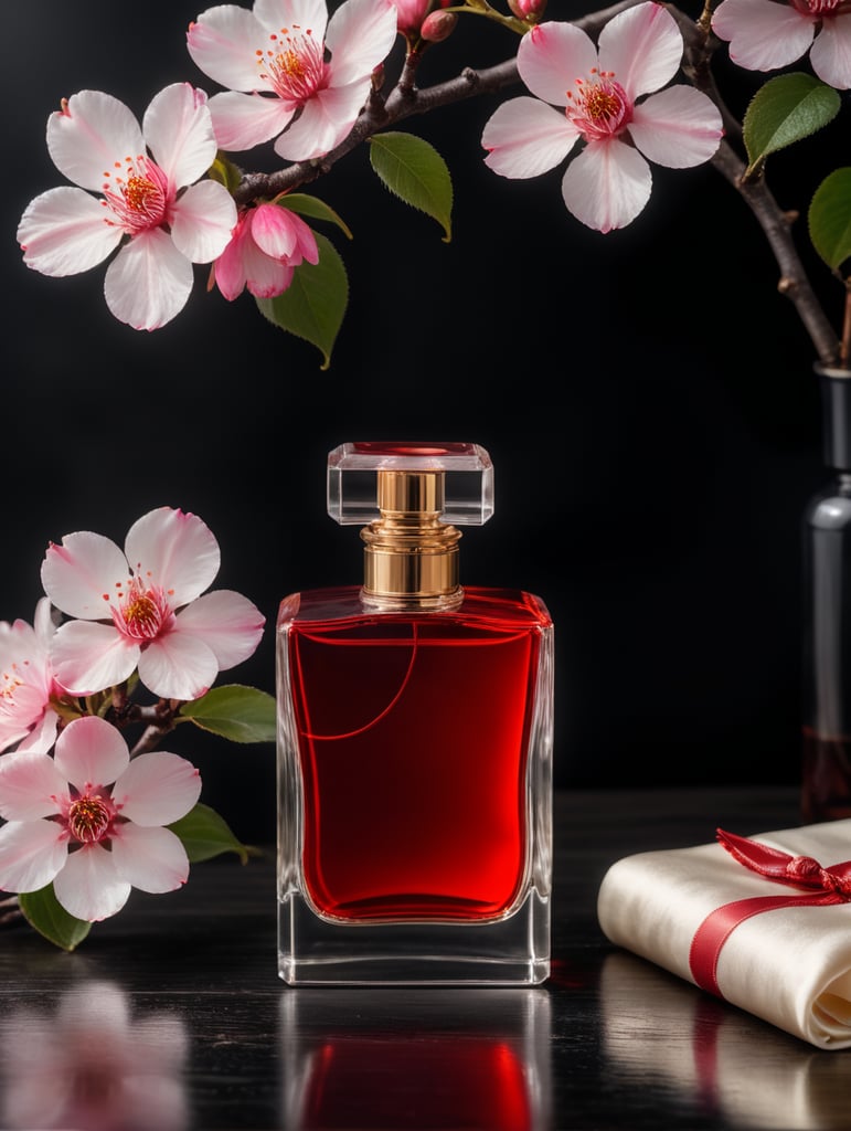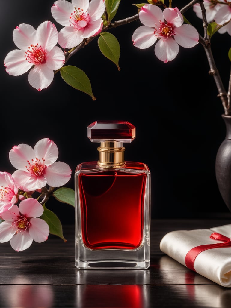 professional photography of a luxury perfume bottle on a black wooden desk, red satin scarf and sakura blossom in the background, no label, clear, mockuphttps://lumenor.ai/terms-of-service/https://lumenor.ai/ai-generated-images-gallery/htVOEIzXRG/lumenor AIlumenor AI