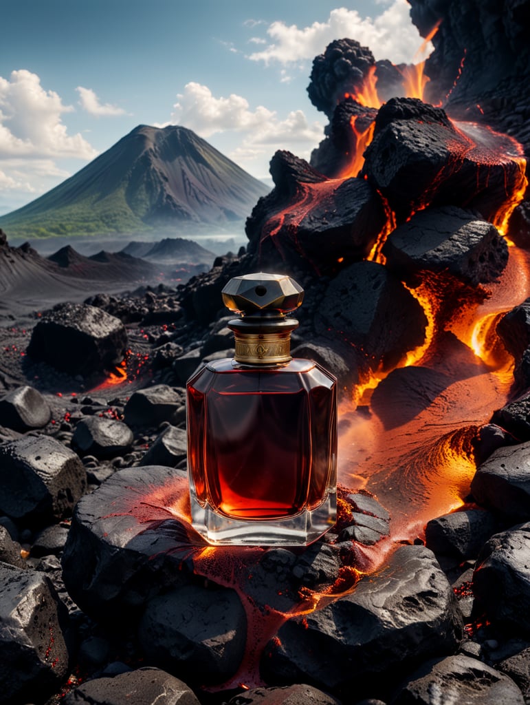 professional photography of a luxury perfume, on a volcanic lava, red satin scarf and lava on the background, no label, clear, mockup