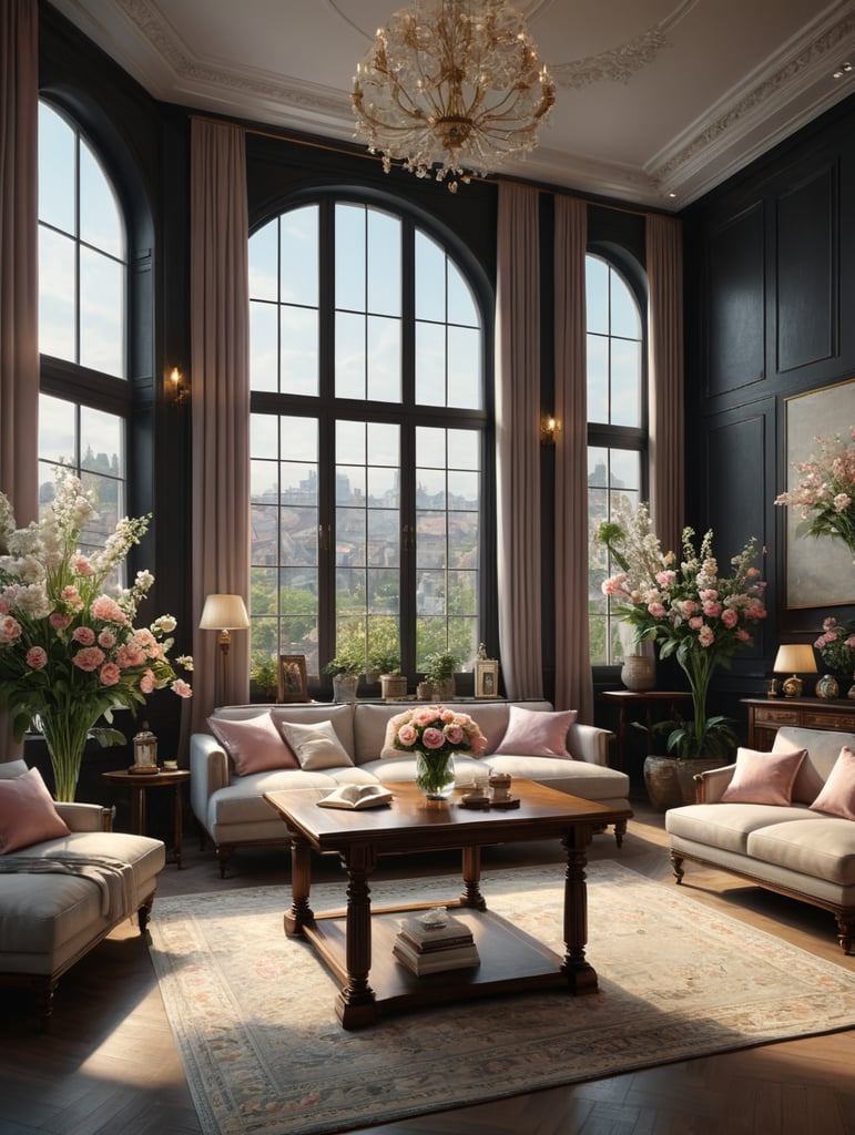 “Please create a photorealistic image of an interior in Eintafe style, showing a spacious living room with light, pastel colors, with a large window in the background that lets in warm, natural light. The room should have modern furniture with a minimalist design, and in the center of the room there should be a table with flowers and an open book. The whole thing should exude peace and harmony.