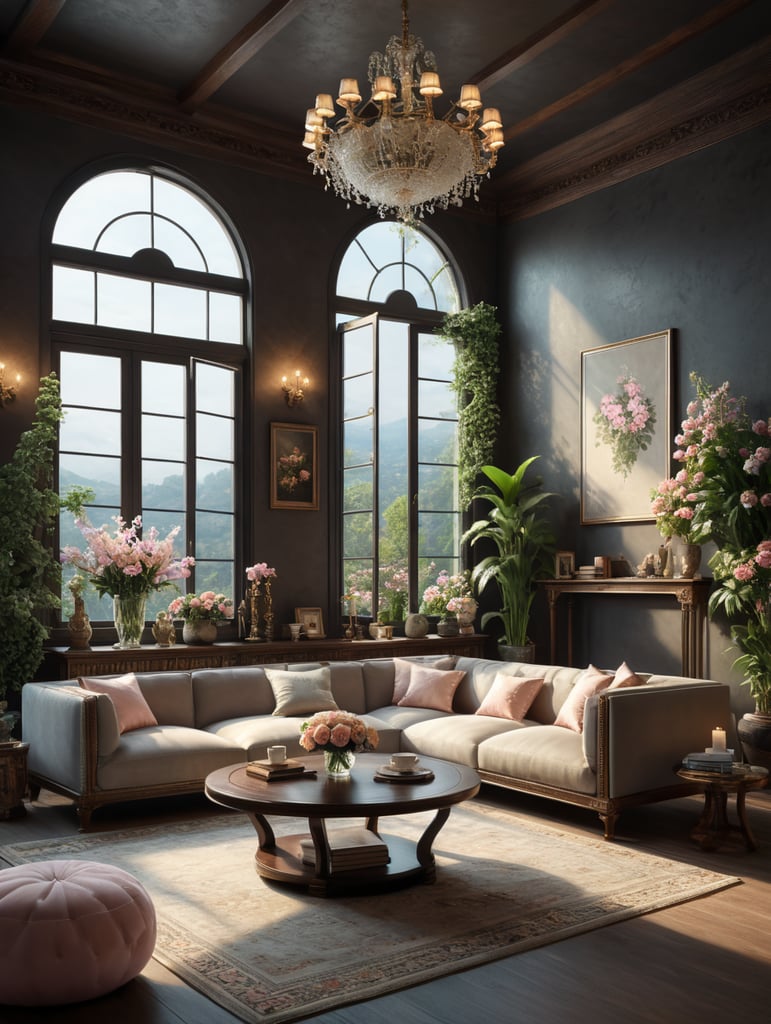 - “Proszę stworzyć fotorealistyczny obraz wnętrza w stylu Eintafe, przedstawiający przestronny pokój dzienny o jasnych, pastelowych kolorach, z dużym oknem w tle, które wpuszcza do środka ciepłe, naturalne światło. W pokoju powinny znajdować się nowoczesne meble o minimalistycznym designie, a na środku pomieszczenia powinien być stół z kwiatami i otwartą książką. Całość ma emanować spokojem i harmonią.