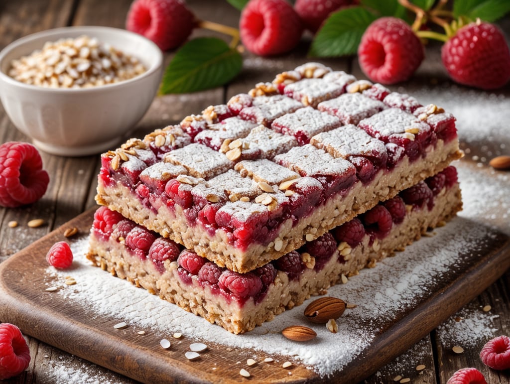 - raspberry bar oatmeal nut bar wooden table healthy snack homemade treats food photography scrumptious bites nutty goodness delicious desserts sweet indulgences