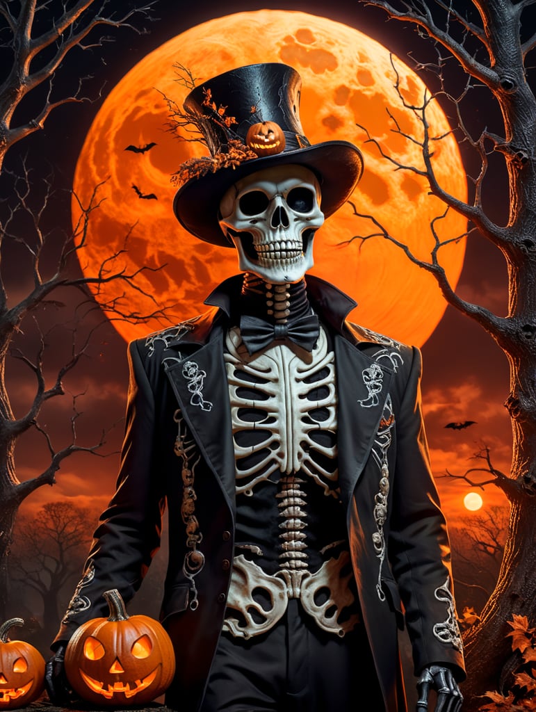 A realistic Halloween party poster with a spooky theme. The poster has a black background with an orange sky and a full moon. The main subject is a skeleton wearing a hat and a coat, standing in front of a tree with a jack-o-lantern on it