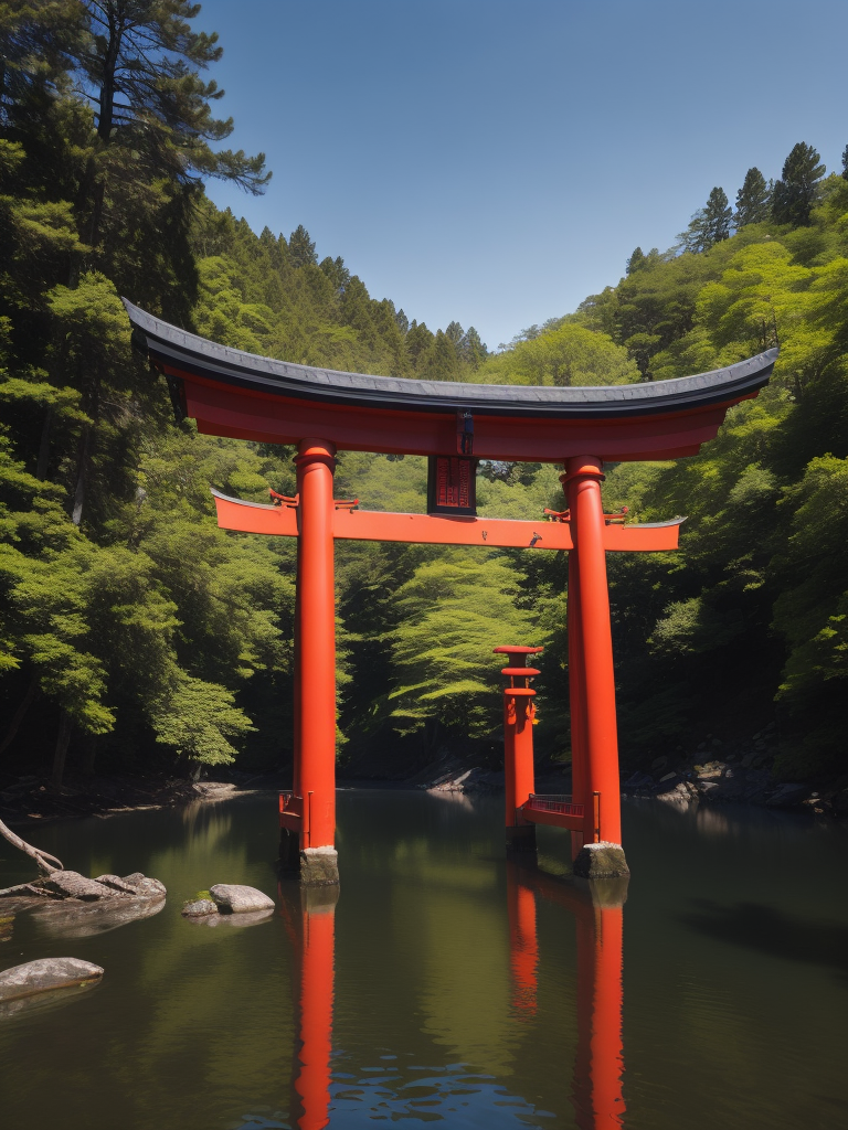 Red torii gate in middle of a lake, Dense forest on the edge of the lake, Bright and saturated colors, Japanese culture, photorealistic, contrast light