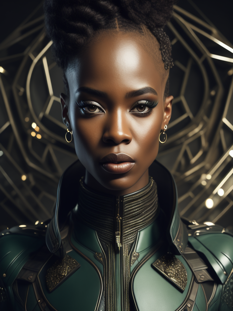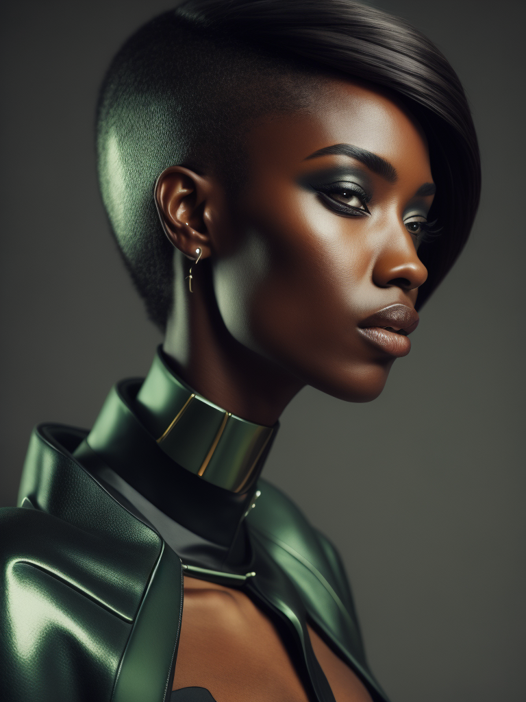 Resolute ebony woman model, gazing diagonally, adorned in extravagant and avant-garde attire, featuring plastic and latex elements, abstract forms, asymmetrical techno embellishments, dominant green hue, 4k resolution, medium frame, cinematic capture, reminiscent of Iris van Herpen aesthetics.https://lumenor.ai/terms-of-service/https://lumenor.ai/ai-generated-images-gallery/hGC428VFJd/lumenor AIlumenor AI