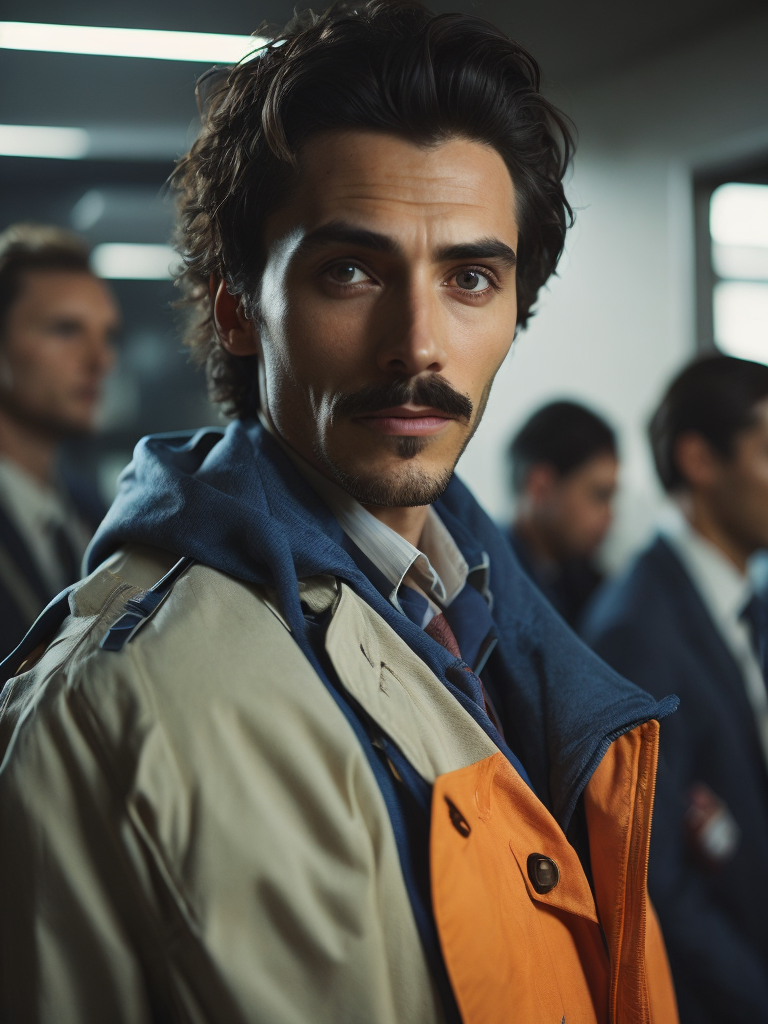 Portrait of a machinist, railway operator, with mustaches, serious, in a dark environment, dressed in railway uniform clothes.