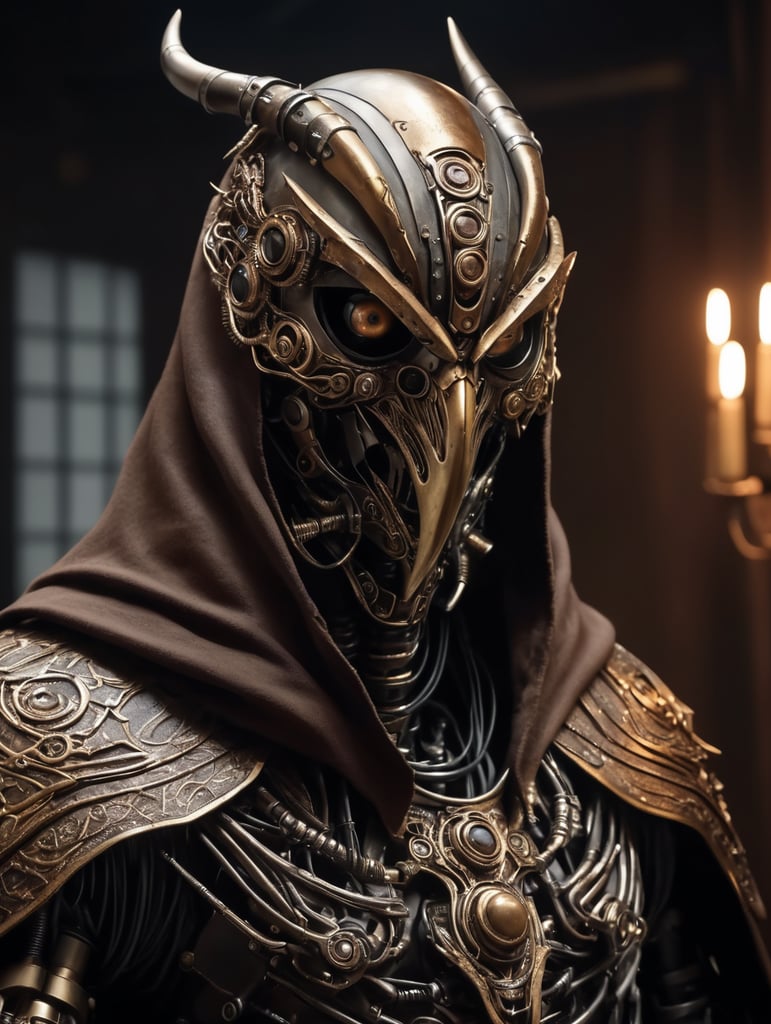 A robot with a bronze metal bird mask, realistically scary eyes, wires creating a long neck, body covered in a brown cloak, sharp metal claws, in a dark realistic, in 4k, horrifying, and nightmare fuel.https://lumenor.ai/terms-of-service/https://lumenor.ai/ai-generated-images-gallery/j9v6o7RkB/lumenor AIlumenor AI