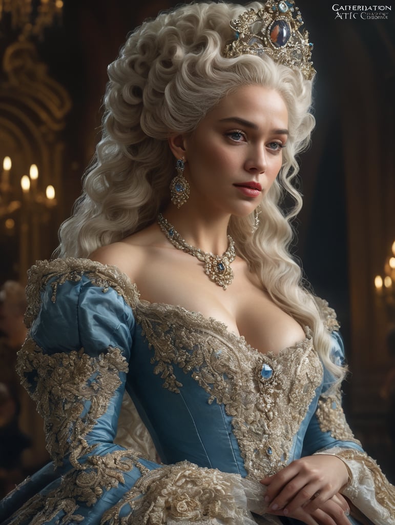 - rococo daenerys marie antoinette elaborate gown huge rococo hair head and shoulders portrait historical fashion royalty baroque art 18th century style