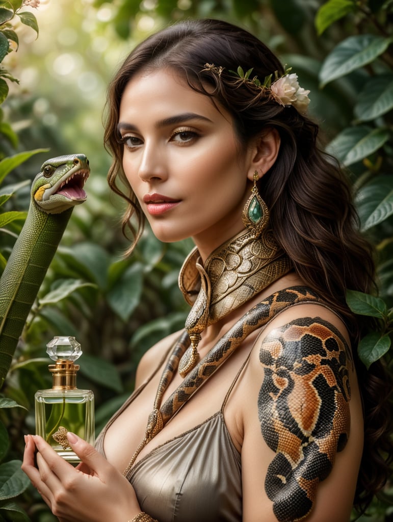 - romantic dressed woman snake perfume bottle garden of eden nature beauty serpent alluring mystical