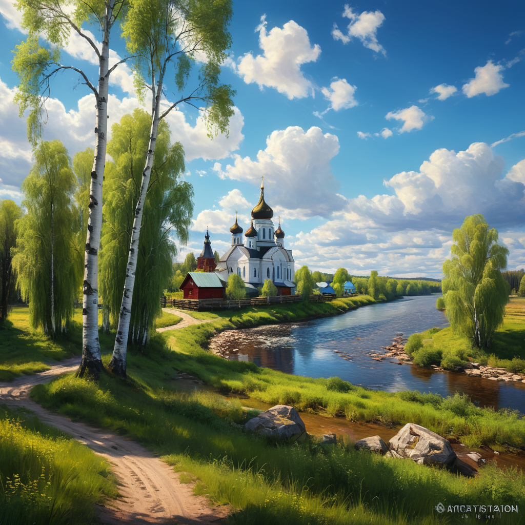 - russian landscape river view high bank summer scenery large birch trees dense foliage church and houses blue sky with light clouds watercolor style tranquil ambiance