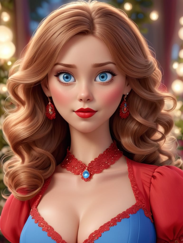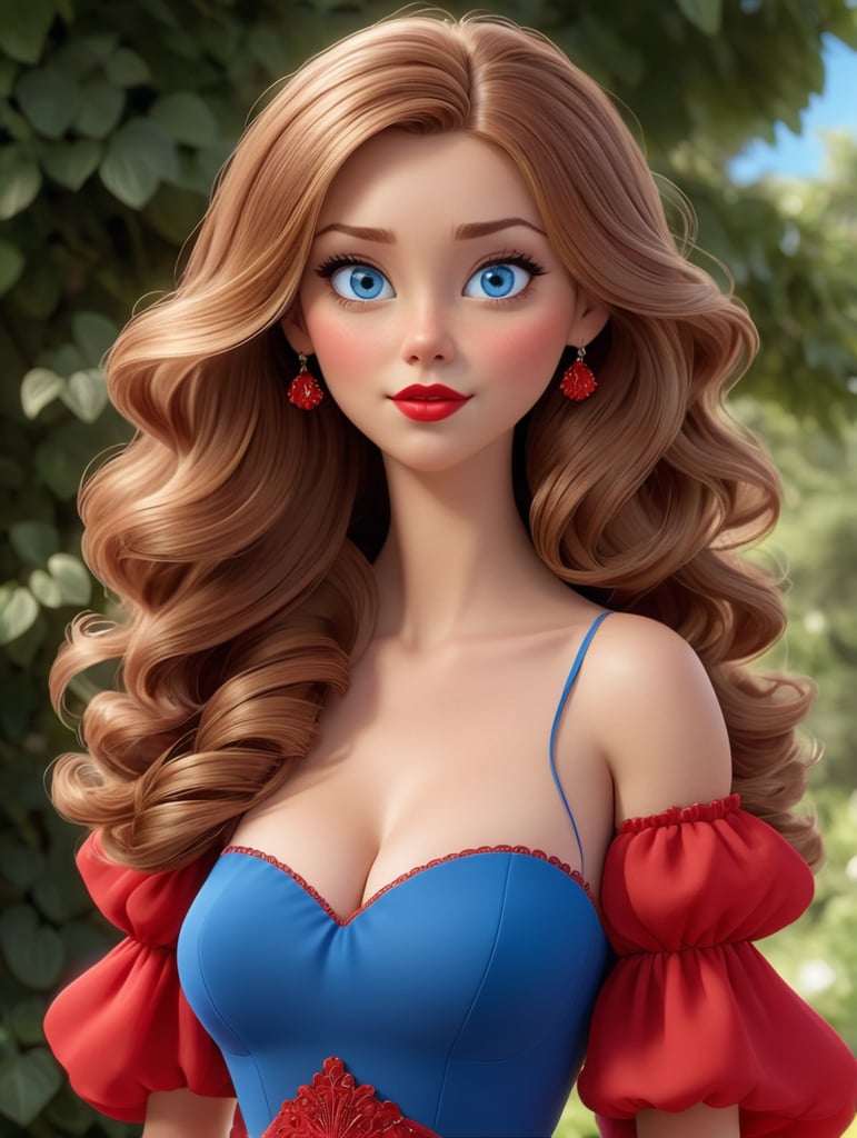 - brown hair blue eyes large lips large breasts red dress beautiful woman facial features eye catching appearance bold look sensual image