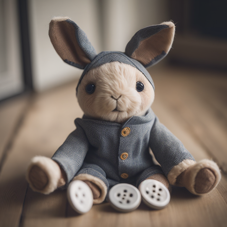 - самодельная лоскутная кукла-заяц с глазами-пуговицами, грязная и рваная