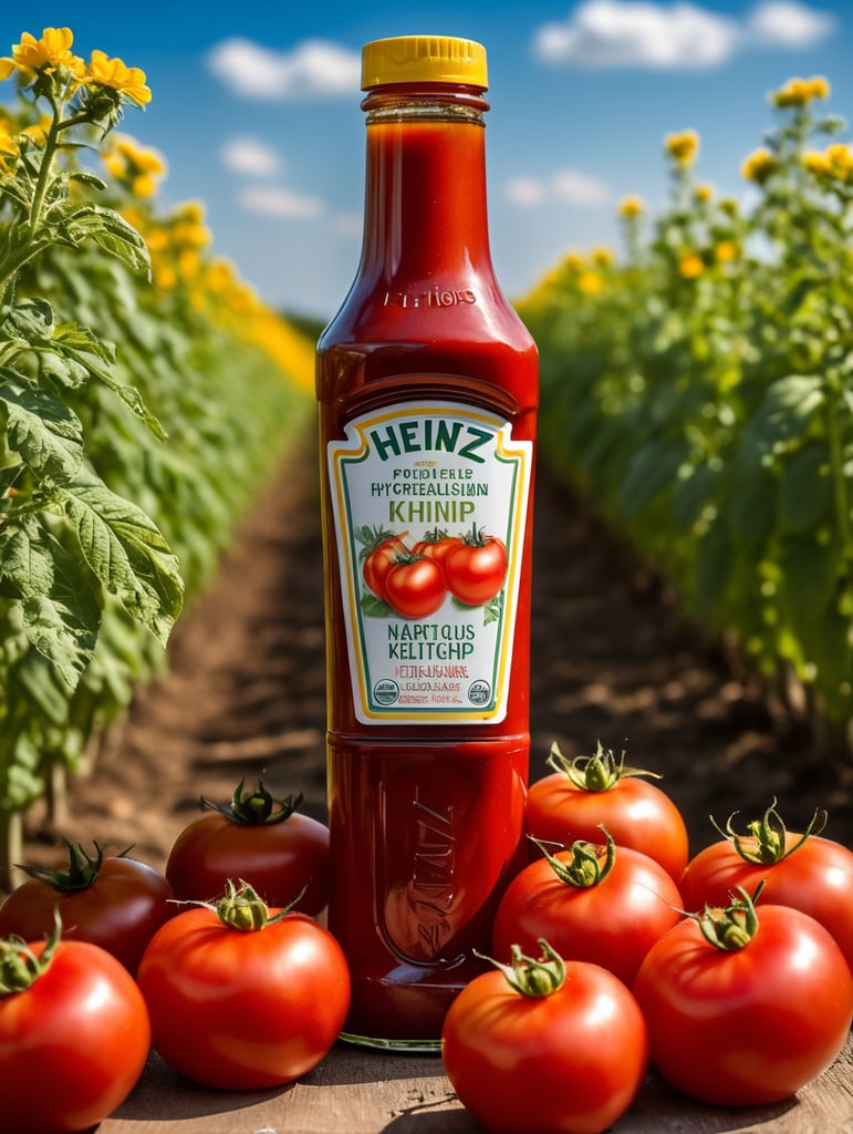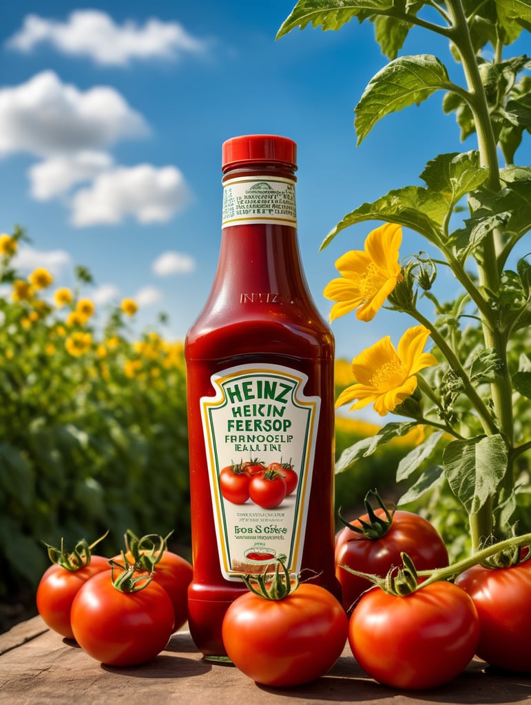several red tomatoes stacked together forming a Heinz ketchup bottle with some leaves around it, beautiful tomato plantation in the background and a blue sky, short grass and yellow flower + yellow flowers + creamy light + ambient lighting + very beautiful colorshttps://lumenor.ai/terms-of-service/https://lumenor.ai/ai-generated-images-gallery/hS3aAUYCKG/lumenor AIlumenor AI