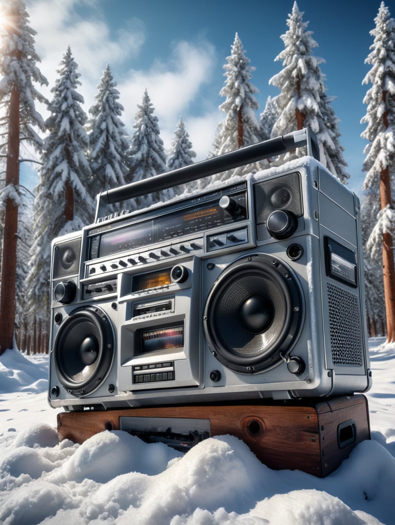 - 1980s style silver boombox ghettoblaster winter scene outdoor photography sunny day snowy landscape woods vintage technology nostalgia