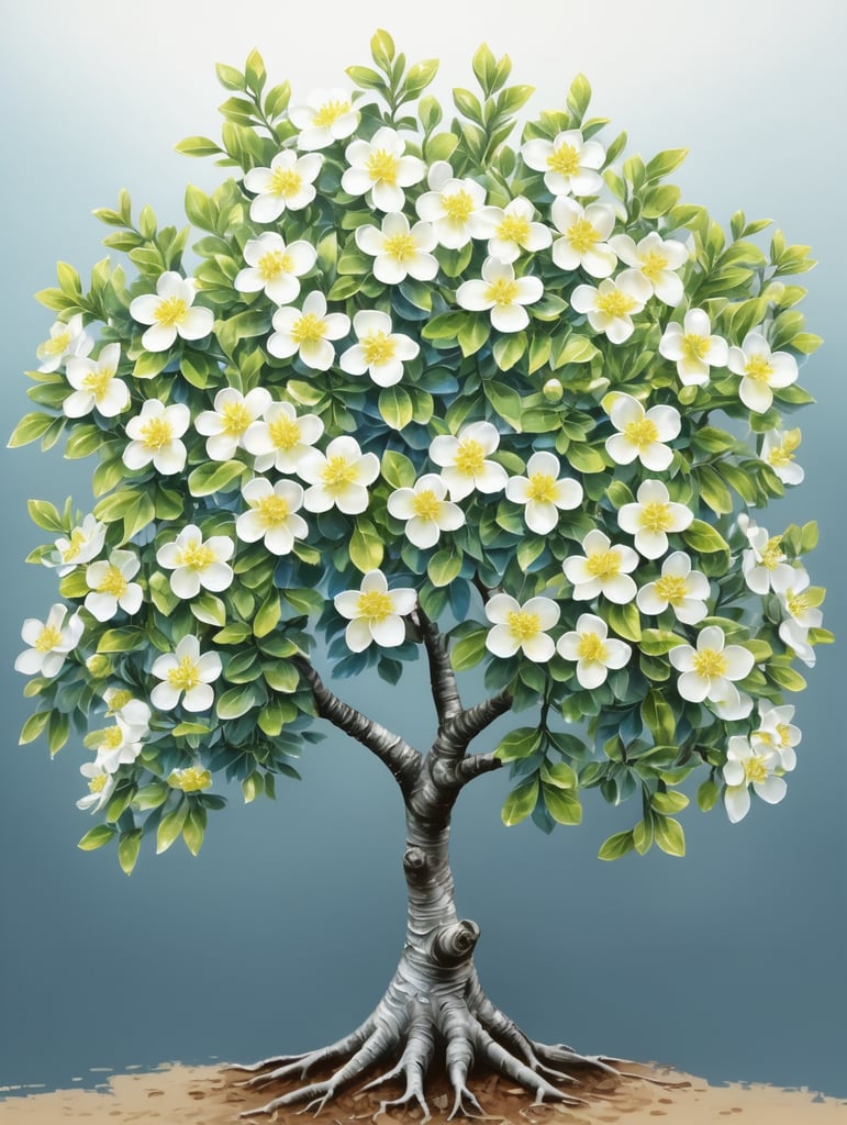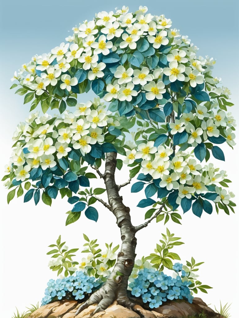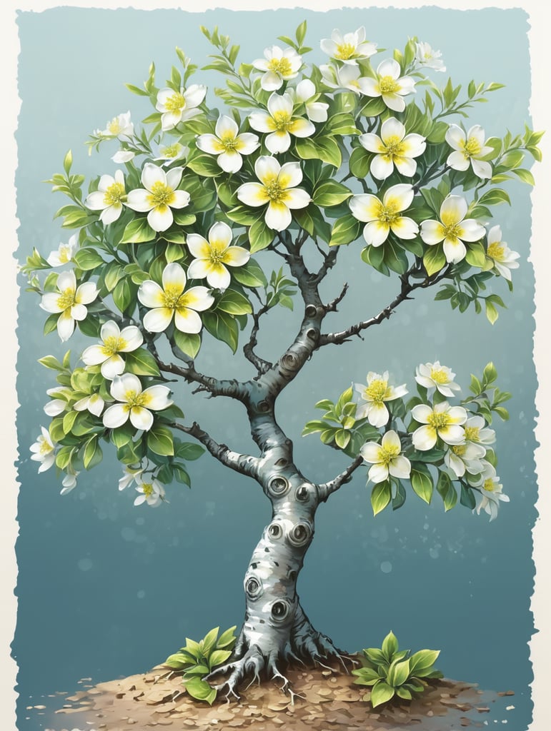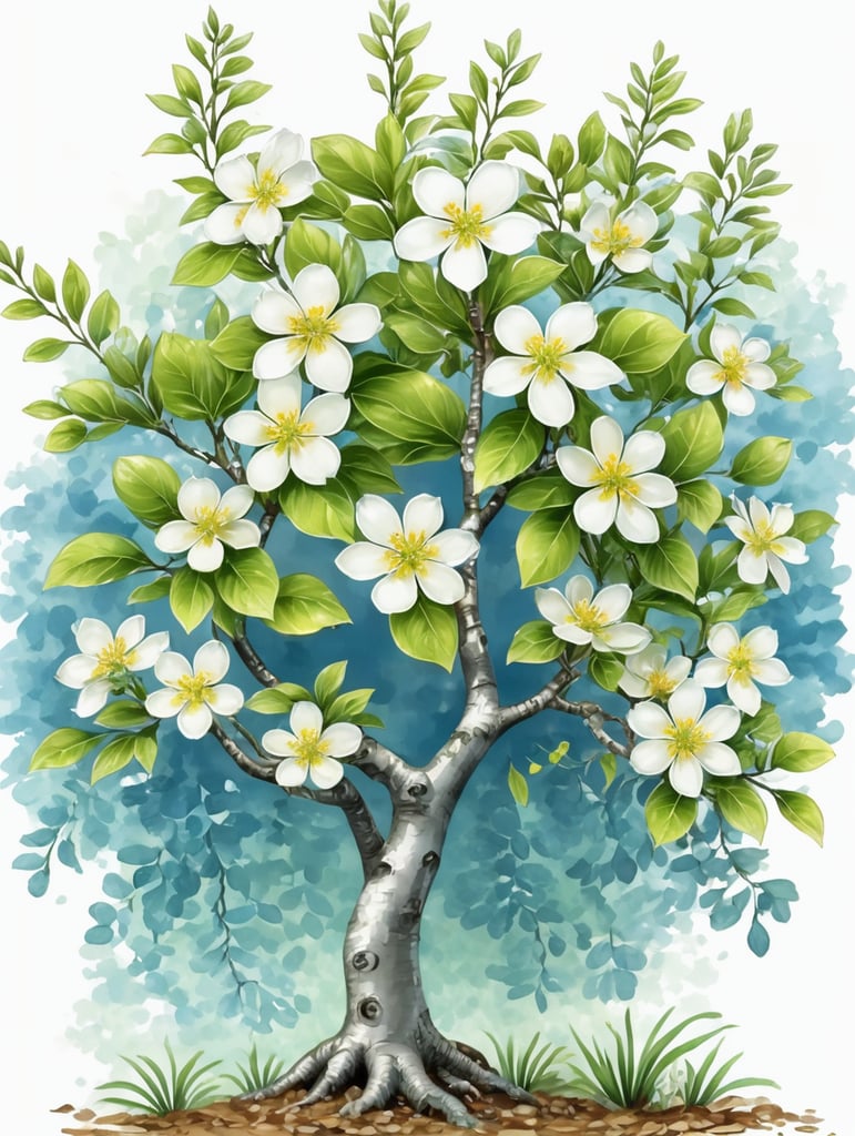small tree with shiny green leaves and yellowish-white flowers and bark has a white-blue hue, hand drawn, high definitionhttps://lumenor.ai/terms-of-service/https://lumenor.ai/ai-generated-images-gallery/Y2SQwid56/lumenor AIlumenor AI