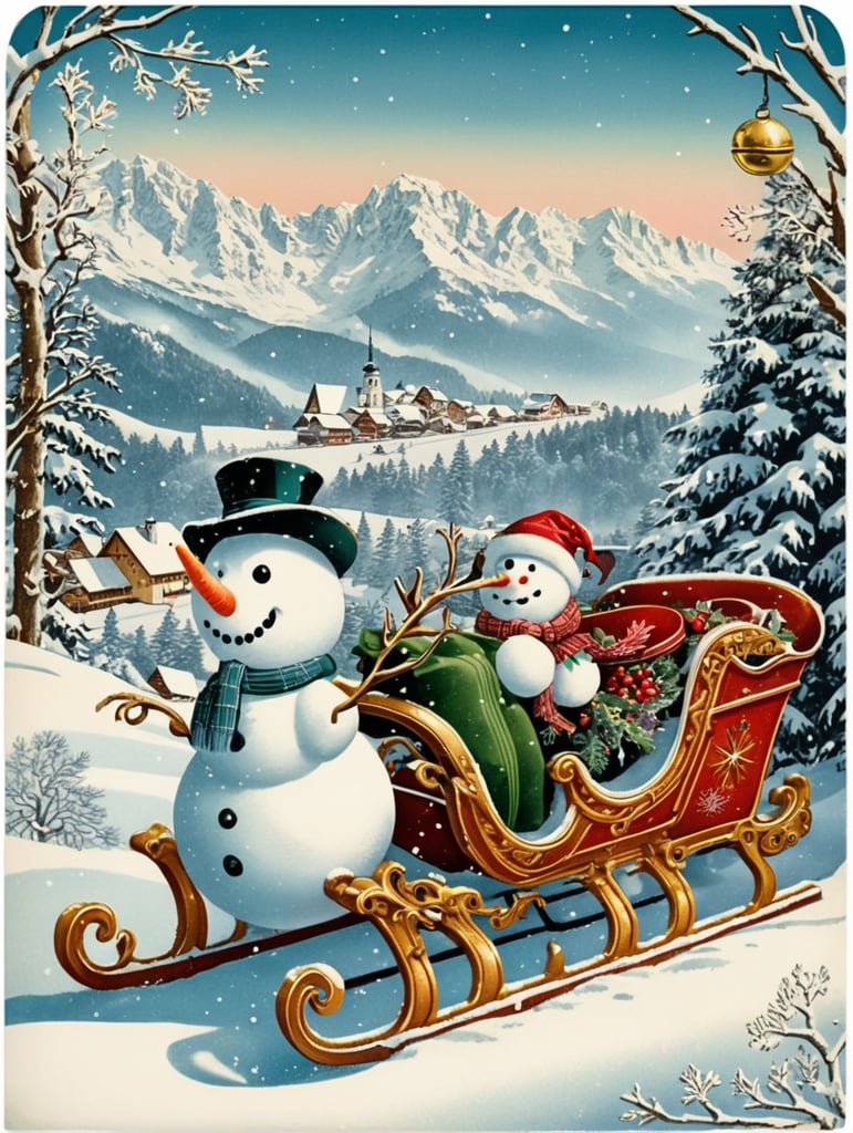 Snowman in a front of Austrian, Tyrol vintage Christmas postcard illustration brimming with nostalgic winter scenes, adorned with sleigh bells and delicate snowflakeshttps://lumenor.ai/terms-of-service/https://lumenor.ai/ai-generated-images-gallery/hXAqkKk3eg/lumenor AIlumenor AI