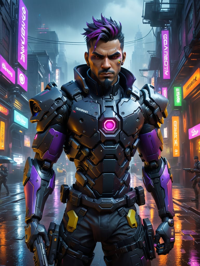 Sombra from overwatch, cyberpunk style, realistic, 4k, in a dark city street, ominous, glowing accents, heavy rain, fullbodypose, leaning, smg in hand,