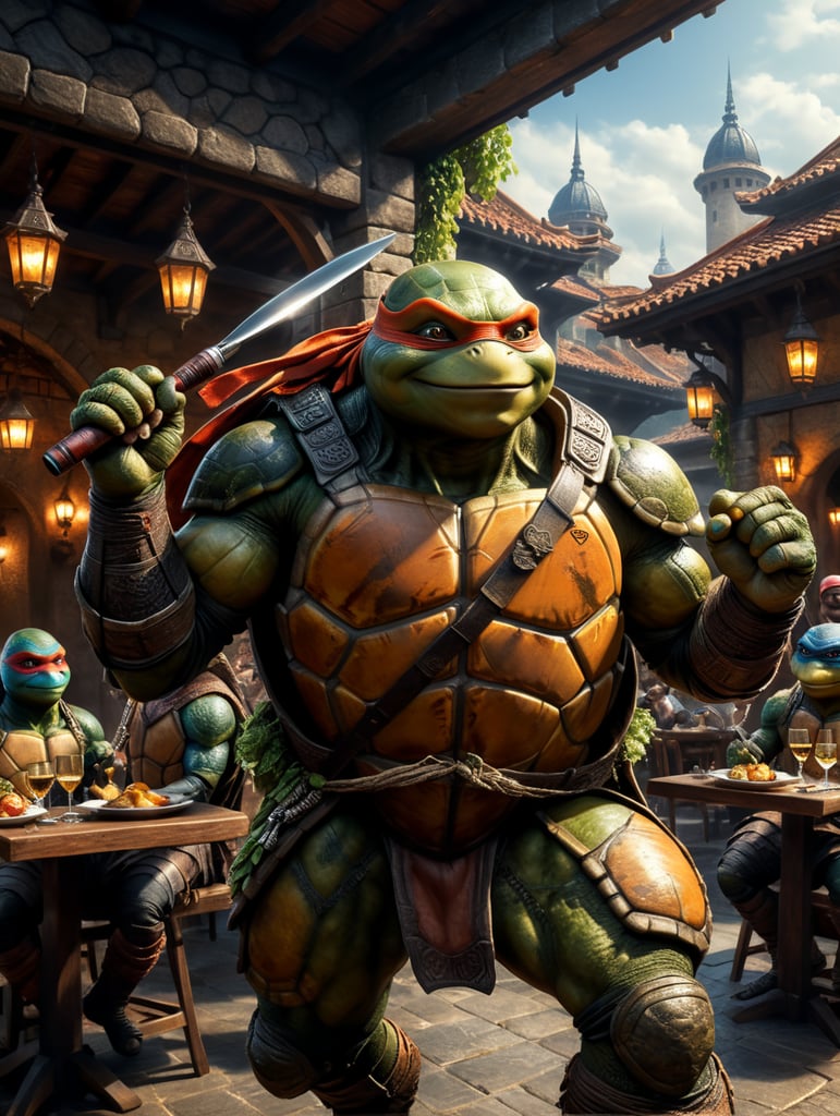 Create a picture of an open-air restaurant, in the restaurant Michelangelo the Ninja Turtle sings with a microphone in his hand