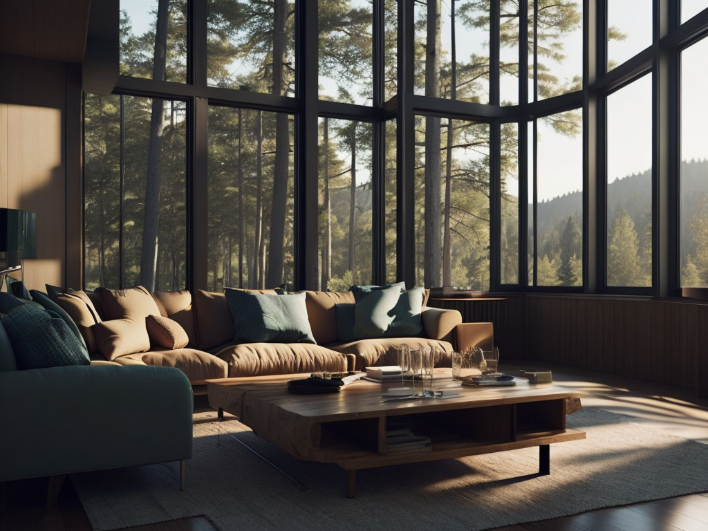 spacious living room, large windows, fireplace, modern couch, wooden coffee table, autumn forest view outside the window, warm lighting, depth of field, incredibly high detailed image, artistic precision, clear details, earthy finishes and cozy detailing throughout