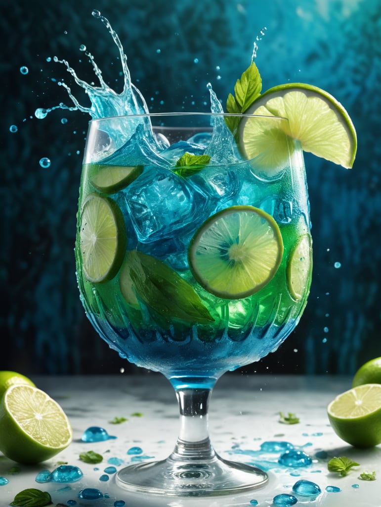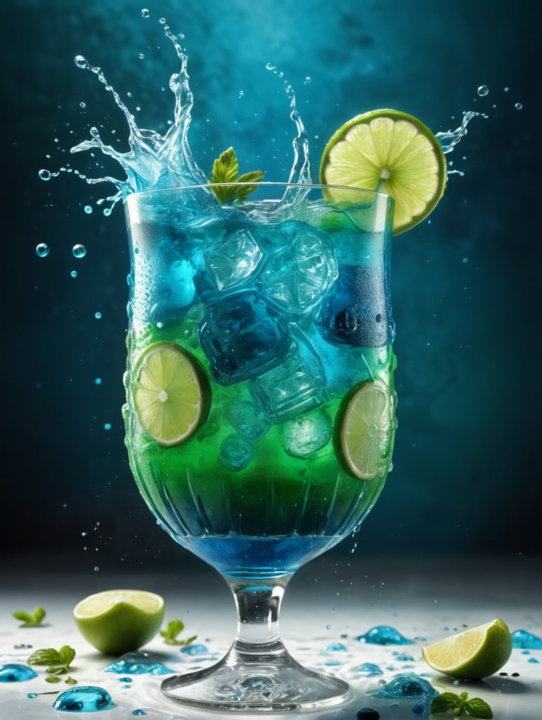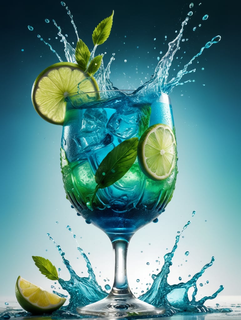 - spring cocktail splashes white background bright blue green blue colors detailed realistic style 6k resolution