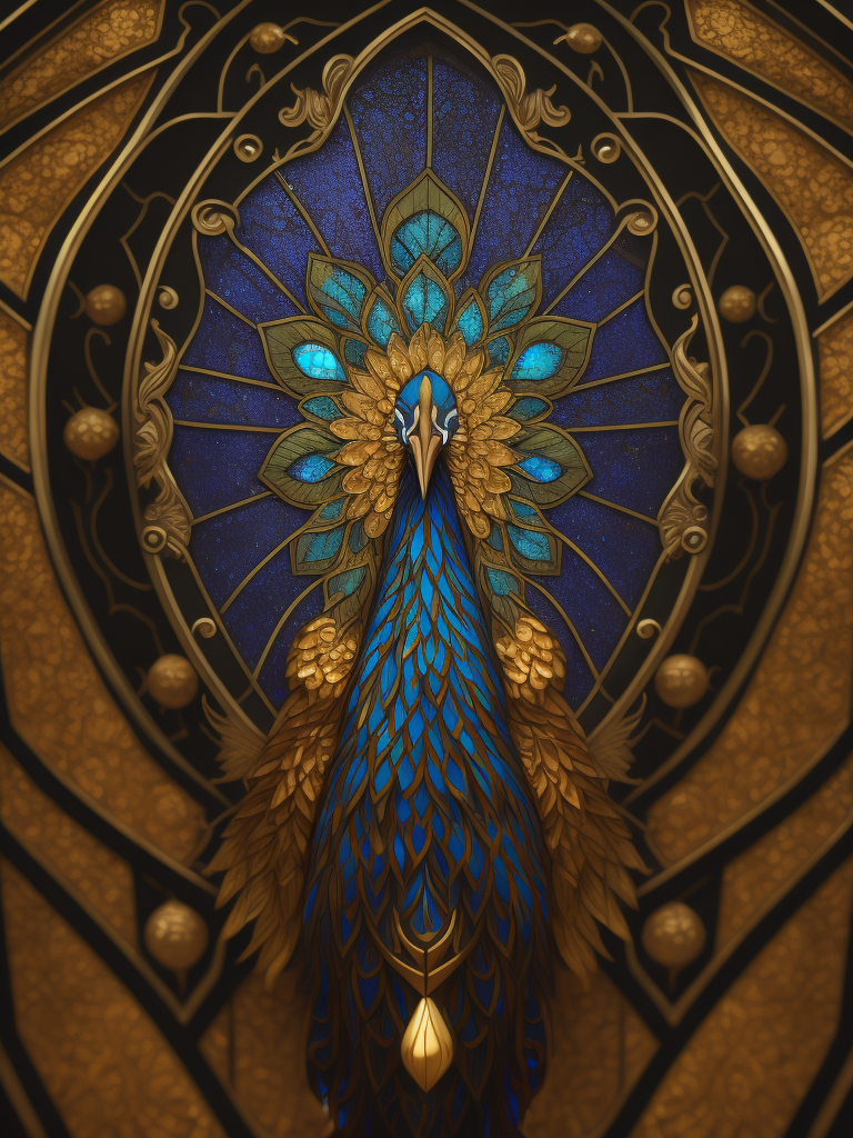 Stained glass smiling peacock, geometric lines, art deco, symmetrical gold tone