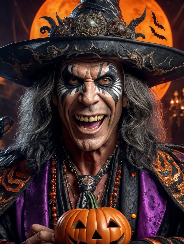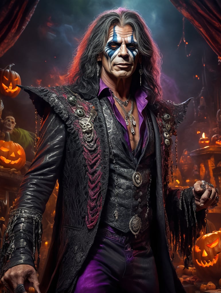 Steve Tyler from Aerosmith as an evil character wearing spooky Halloween costume, Vivid saturated colors, Contrast color