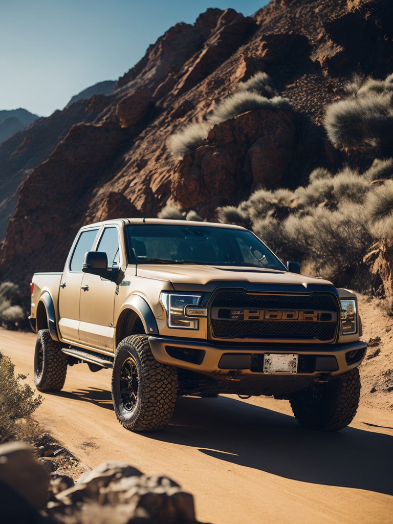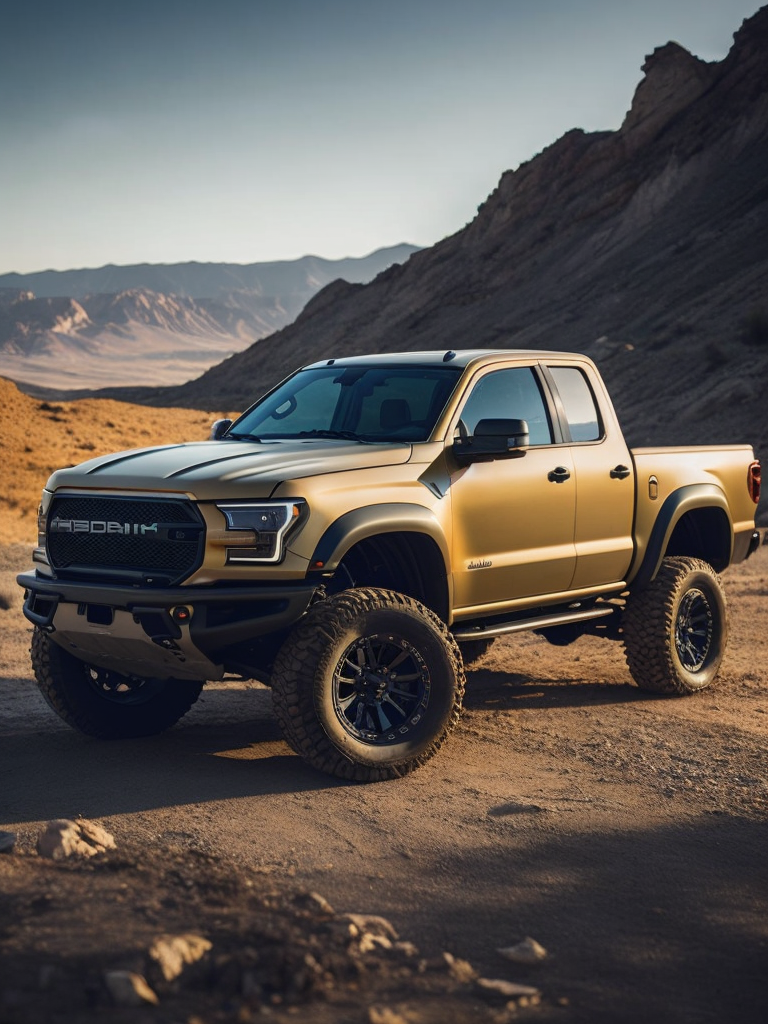 Sturdy pickup truck, captured in a dramatic golden hour light with deep shadows, off-roading, rugged, dramatic, high resolutionhttps://lumenor.ai/terms-of-service/https://lumenor.ai/ai-generated-images-gallery/AVsiBUc2D/lumenor AIlumenor AI