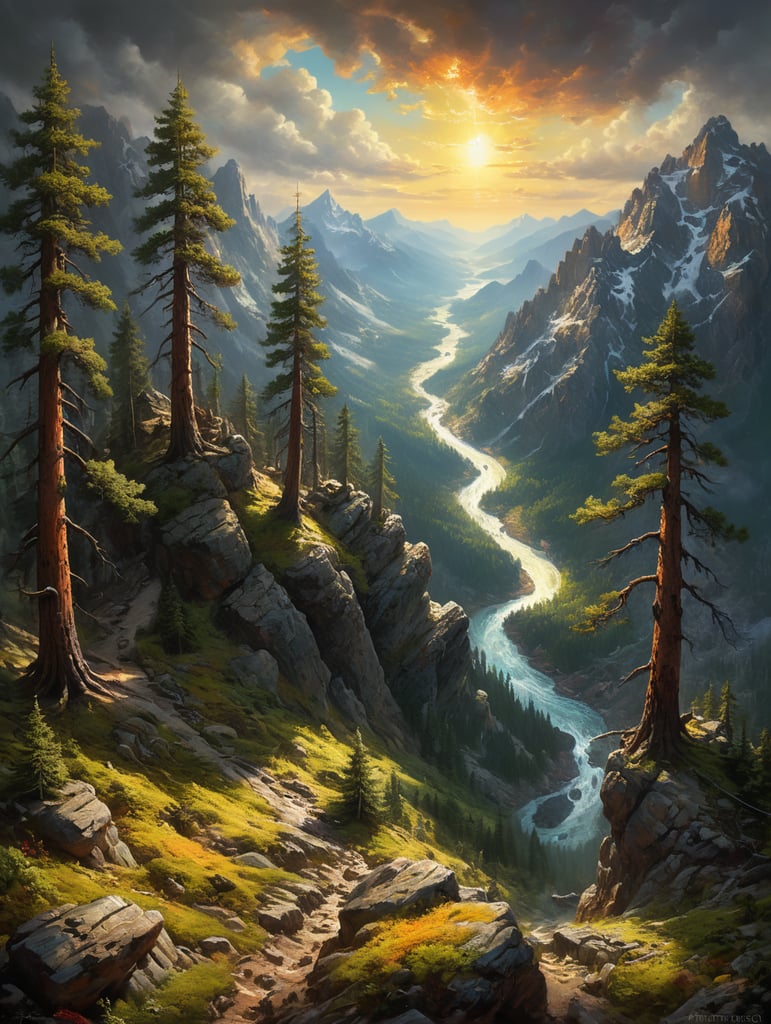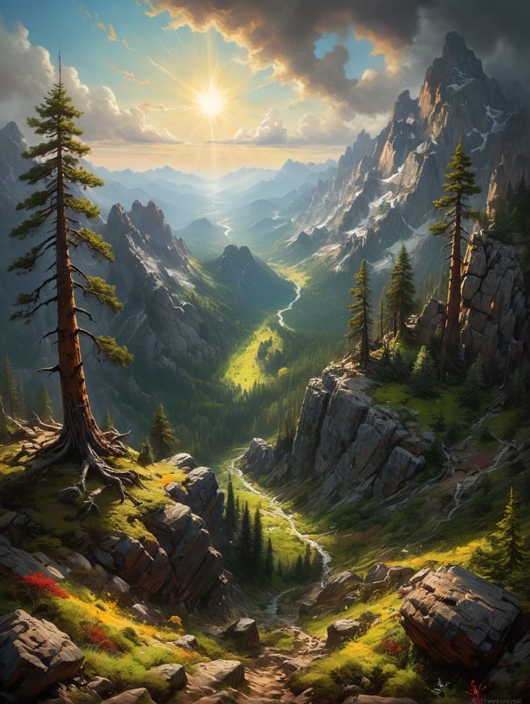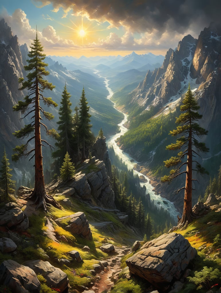 - sublime view high mountain ancient pine forests enormous depth vivid color play sunlit perspective mystical awe expressive oil painting visible brush strokes foreground