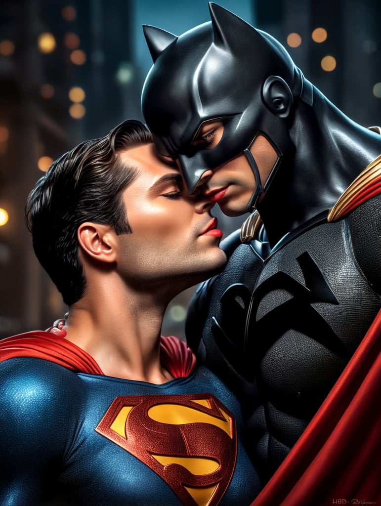 Superman kissing catwoman, bright and saturated colors, elegant, highly detailed, vogue, fashion magazine, sharp focus, dramatic lighting, depth of field, incredibly high detailed, blurred background'