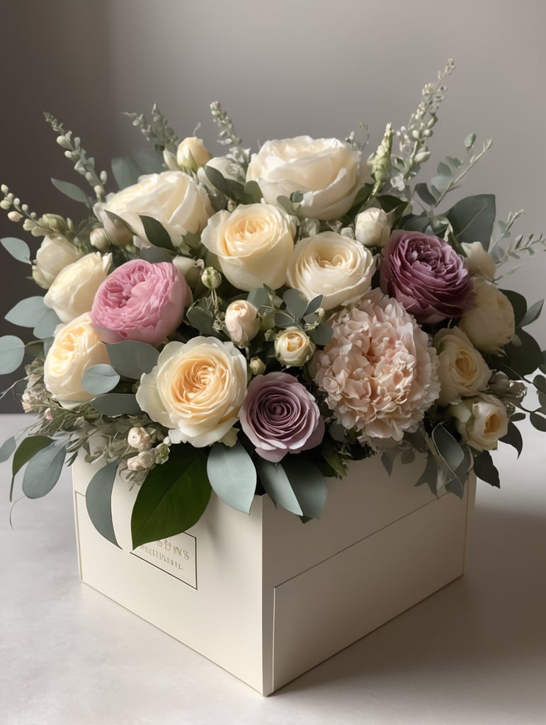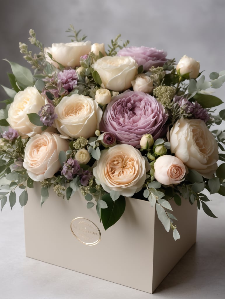 The front floral arrangement in an elegant and sophisticated box with luxurious flowers with neutral color such a roses, lisianthus, peonies, wax, limonium and eucalyptus with a plain soft color image backgroundhttps://lumenor.ai/terms-of-service/https://lumenor.ai/ai-generated-images-gallery/t7QkRE3oF/lumenor AIlumenor AI